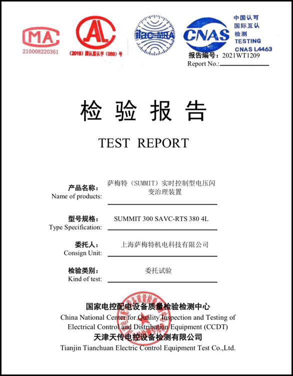 萨梅特实时控制型电压闪变治理装置 (SUMMIT SAVC-RTS) | 对于半导体晶圆制造、半导体封测、电子、光电、汽车制造、化工、医疗等行业的敏感性用电负载,解决电压闪变、电压暂降、电压暂升问题的有效措施是在供电电源与敏感性用电负载之间串联SUMMIT SAVC-RTS,SUMMIT SAVC-RTS有以下全球领先的优势: (1)仅在电压闪变时介入,高效率,免维护,更安全; (2)深度电压闪变才是真正危害和用户痛点,保护能力0-130%额定电压完美支撑,电压暂降、电压闪变、电压中断、电压暂升全治理,真正解决用户痛点; (3)快速切换时间小于100μs(0.1ms),全响应时间通常在1ms左右; (4)可选配维修机械旁路,当系统出现故障时,断开维修机械旁路,以便对系统进行检修; (5)拥有CE认证(欧盟); (6)拥有性能测试认证(国家电控配电设备质量监督检验中心); (7)电压闪变治理技术的全球开创者和引领者 |